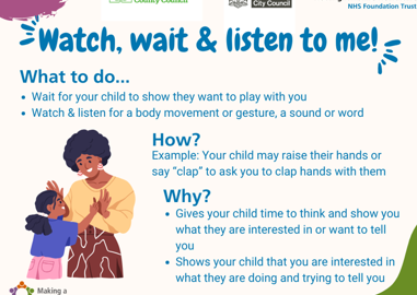 There will be a range of posters sent to all settings on the 2nd Monday of each month hopefully the first one will be sent next week – each poster will that contains key skill to ensure quality interactions, there will then be follow up releases including a story, rhyme, sign and suggested indoor / outdoor activities to support the interaction skill – these will be accompanied by video clips demonstrating the skill being developed.