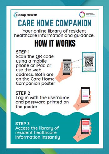 Every care home should have their own unique QR code access for the Care Home Companion or can access via the generic link on the QR poster – see below. This resource will provide current expert guidance on a wide range of healthcare management issues such as hydration and nutrition, falls, tissue viability, dementia to name a few. Take a look!!