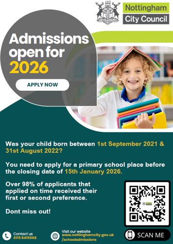 The School Admission Team can be contacted on 0115 8415568 or further information is on their website – www.nottinghamcity.gov.uk/schooladmissions