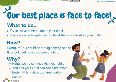 There will be a range of posters sent to all settings on the 2nd Monday of each month hopefully the first one will be sent next week – each poster will that contains key skill to ensure quality interactions, there will then be follow up releases including a story, rhyme, sign and suggested indoor / outdoor activities to support the interaction skill – these will be accompanied by video clips demonstrating the skill being developed.