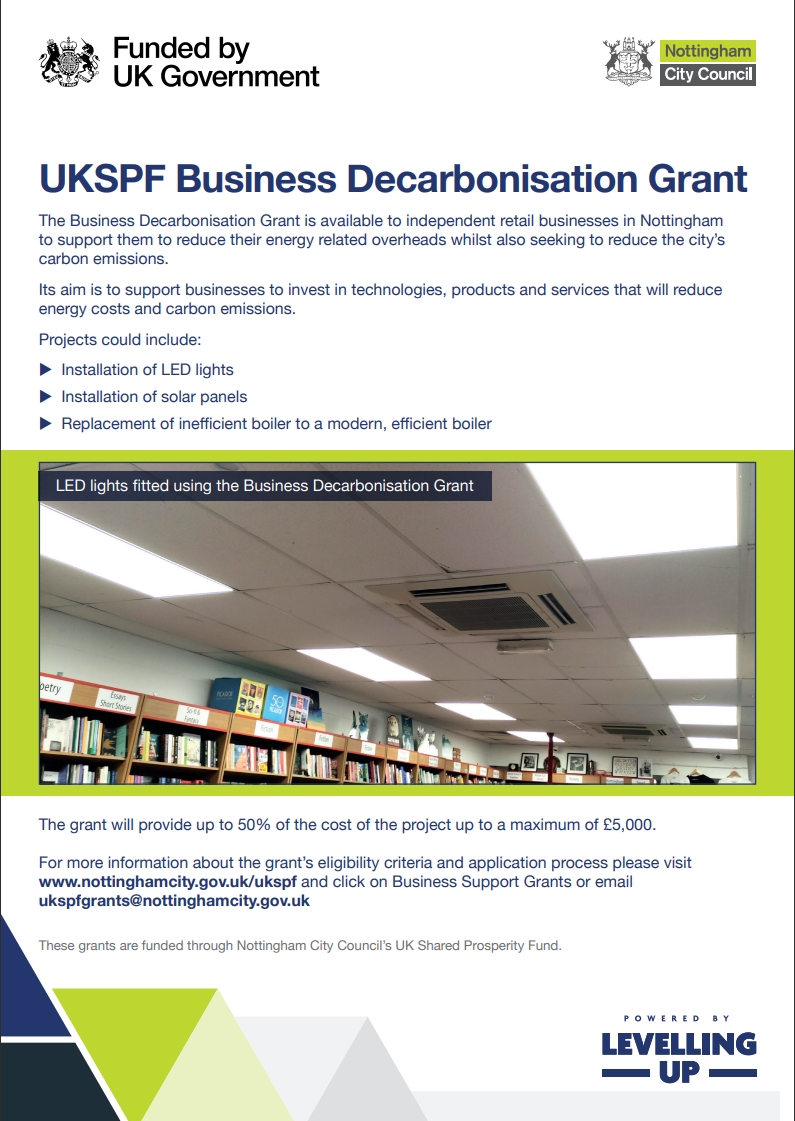 The Business Decarbonisation Grant’s main objective is to support retail businesses in eligible areas of Nottingham to reduce their energy related costs whilst also seeking to reduce the city’s carbon emissions. This will allow businesses to increase their profit margins, protect employment for residents of Nottingham and our localised economy.