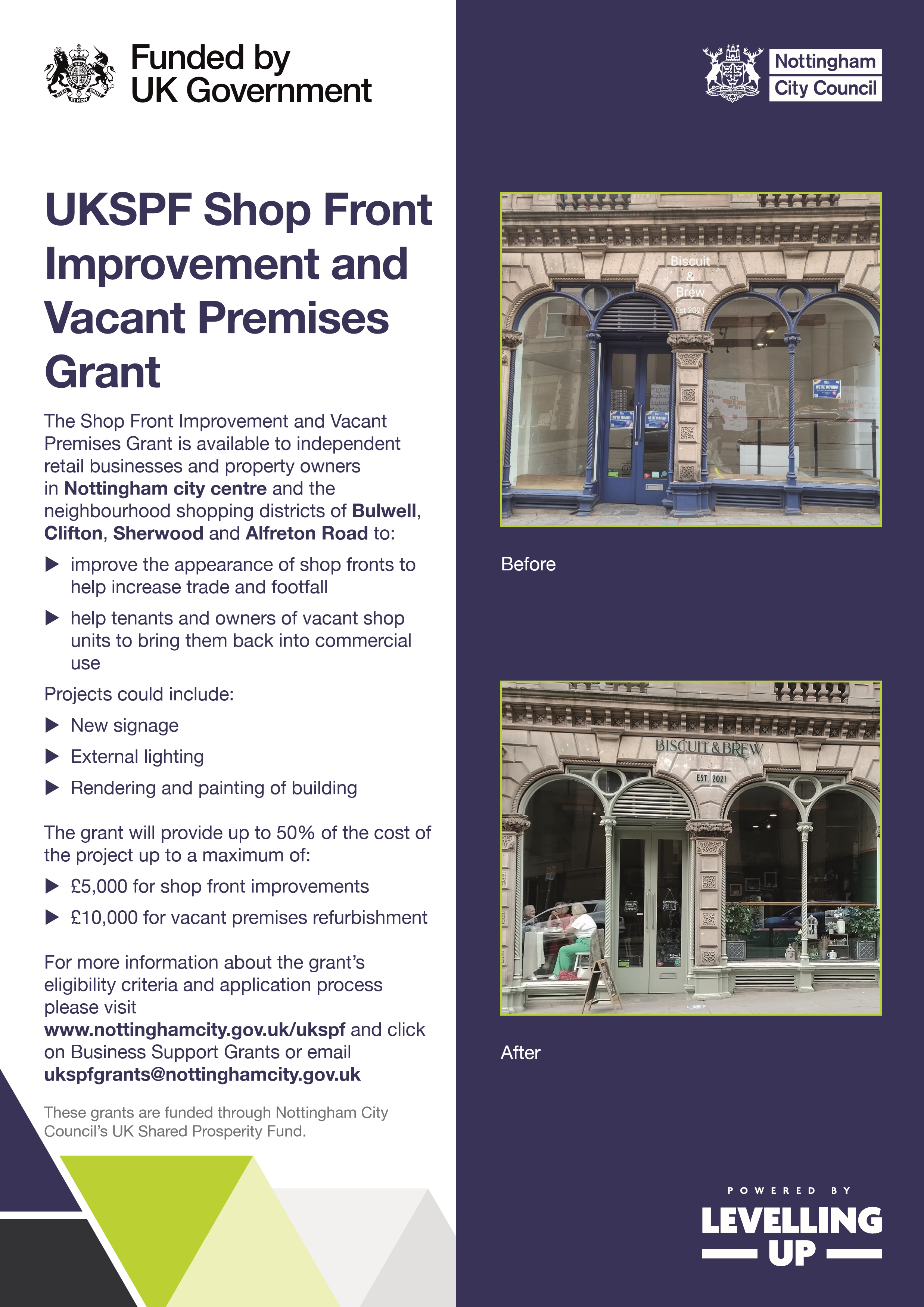 The Shop Front Improvement and Vacant Premises Grant is available to independent retail businesses and property owners in Nottingham to improve their shop front or to bring vacant premises back into use. The objective of the grant is to support traders and the local economy as well as improving the retail environment for shoppers, residents and visitors.
